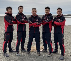 冬場の練習は、午前に水上練習60分、その後身体の繋がりを良くするトレーニングを40分。 午後は室内でエルゴマシン(漕ぐ力を高める機械)とウエイトトレーニングを組み合わせたサーキットトレーニングを100分。 最後に海沿いの一本道を力の限り12分間全力で走り出し切ります。